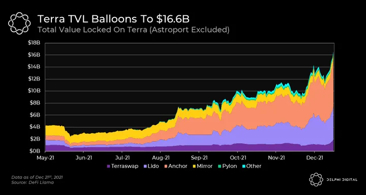 Terra’s TVL has grown to $16.6B, cementing it as the second largest L1 ecosystem behind Ethereum according to DeFi Llama.