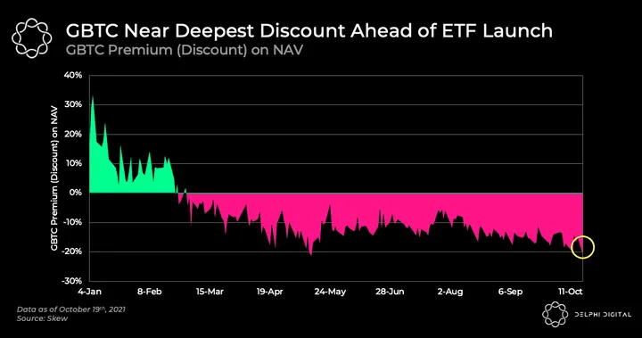 - GBTC is currently trading near its steepest discount of the year on the back of the ProShares Bitcoin Futures ETF launch today.