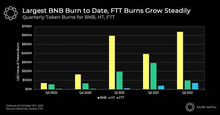 - An important point to note is that the formula for Binance quarterly token burns are not specifically disclosed, hence it is difficult to ascertain whether the burns are a direct result of higher trading volume and revenue. FTX burns FTT equal to a third of exchange fees while Huobi dedicates 15% of total revenue to HT burns, drawing a direct correlation between the two.
