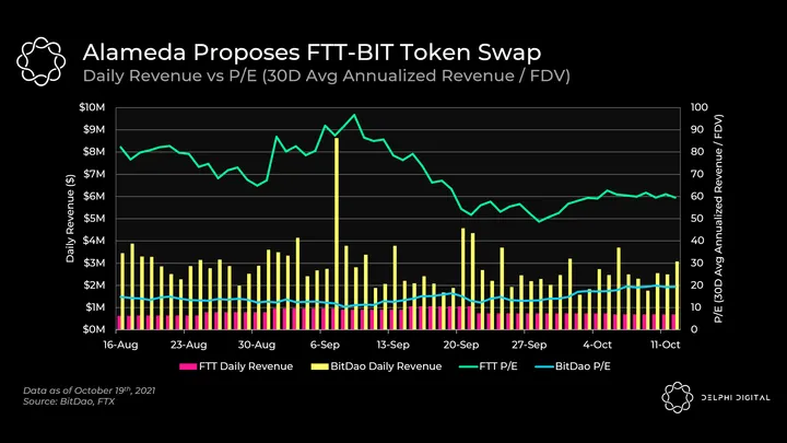 - FTT currently trades as a higher price multiple when the two are measured against the amount of revenue dedicated to either token burns (in FTT’s case) or a treasury (BIT). Notably, BIT tokens earn higher daily revenue than FTT tokens, which can be backed into by breaking down FTT’s weekly token burns.