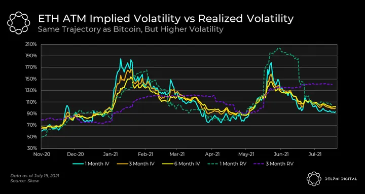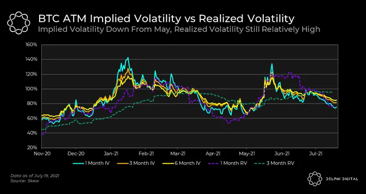 - It’s worth checking out the same chart for ETH. It follows the same pattern as BTC, but there was a massive spike in realized volatility thanks to ETH’s rally into May and subsequent implosion.