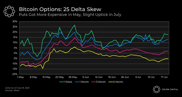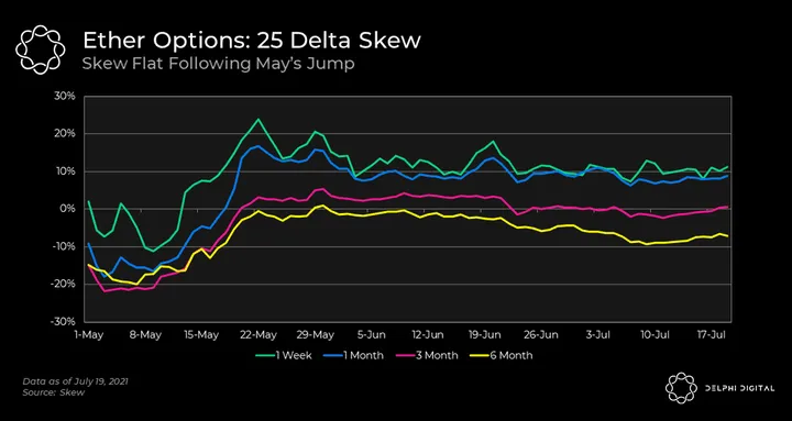- We see a large increase in mid-May — from days before the crash right into early June. This indicates that there was more demand to buy puts than calls. Since then, skews across option durations have fallen by a small amount. But we did see an uptick in recent days, which was especially pronounced in the 1 week options as investors and traders look for downside protection.