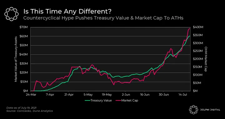 - OHM, OlympusDAO’s token, has exhibited countercyclical behavior off late, making investors a fair amount of gains while the broader market pulls back.