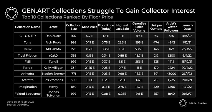 - GEN.ART has been struggling to grow collector demand for its artworks. There have been under 2,000E in secondary sales on all its collections on OpenSea till today. Except for Toha and Fjall, the rest of the collections have less than 100E in secondary sales volume. To put this in context, a single ABC collection like Memories of Qilin has done more volume (2,400E) in secondary sales than all the GEN.ART collections combined. In that sense, many GEN.ART collections appear to be comparable to Art Blocks Factory collections.