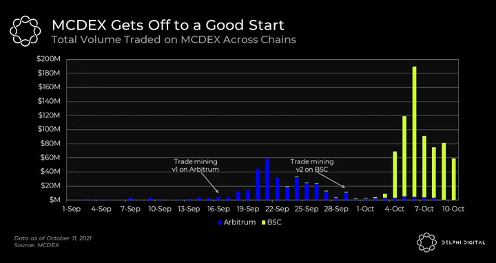 - MCDEX is an on-chain platform to trade futures and derivatives. The project launched on mainnet alongside Arbitrum on Aug. 31, and followed through with a deployment to BSC on Sep 28. Over $1B of volume has been traded on MCDEX since it launched.