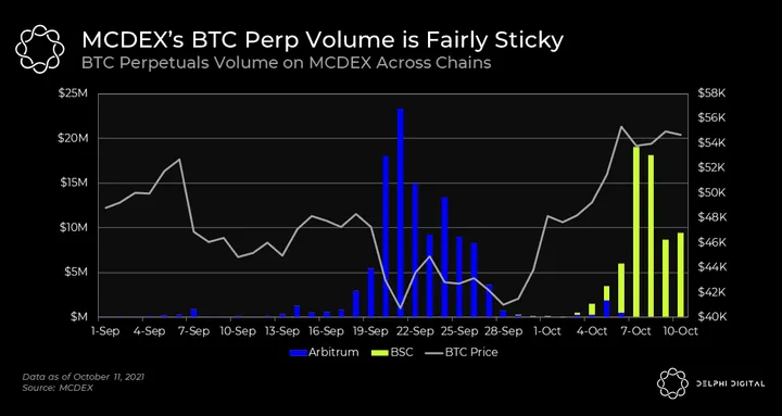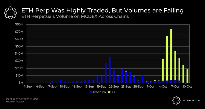 - Incentive programs on both Arbitrum and BSC attracted traders to the platform. However, as Arbitrum incentives got depleted, volume fell dramatically. We could be seeing a similar trend with MCDEX on BSC, as the incentive program ends in two days, but the DEX is still doing over $50M of daily volume. While this highlights the importance of incentives to bootstrap a new product, it’s worth noting that fresh incentives are coming to BSC.