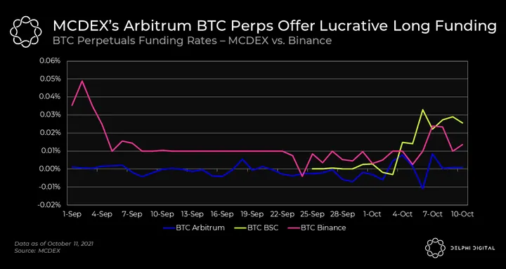 - For BTC perpetuals, funding rates on Arbitrum have been consistently lower than Binance. But liquidity on Arbitrum is fairly dry. At the time of writing, MCDEX on Arbitrum can issue 11.5 BTC worth of longs for 0.14% slippage. At that same slippage level, MCDEX on BSC can issue 167 BTC worth of longs.