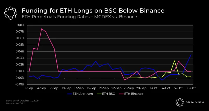 - However, MCDEX governance recently sanctioned a USD-ETH perpetual on BSC. This would allow users to use ETH as collateral to either long or short ETH, which opens the door to basis trades when funding rates are positive (i.e. deposit collateral, open 1x short, earn funding with no price risk).