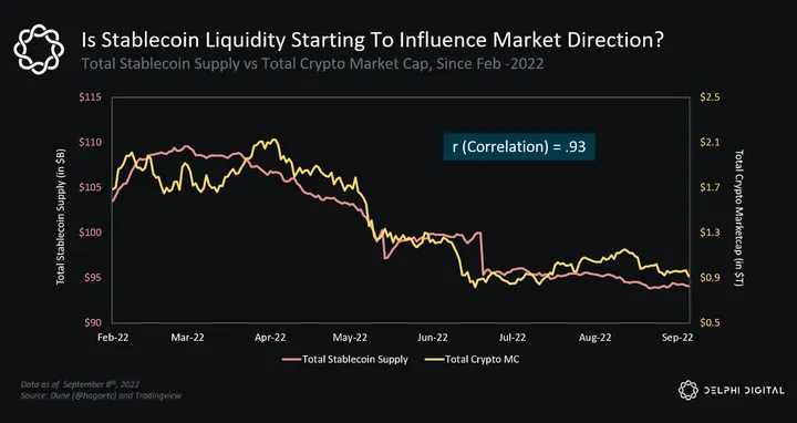 - Of course, stablecoin issuance and USD liquidity are two completely different beasts, but we can draw a parallel to the change in stablecoin supply versus total crypto market cap.