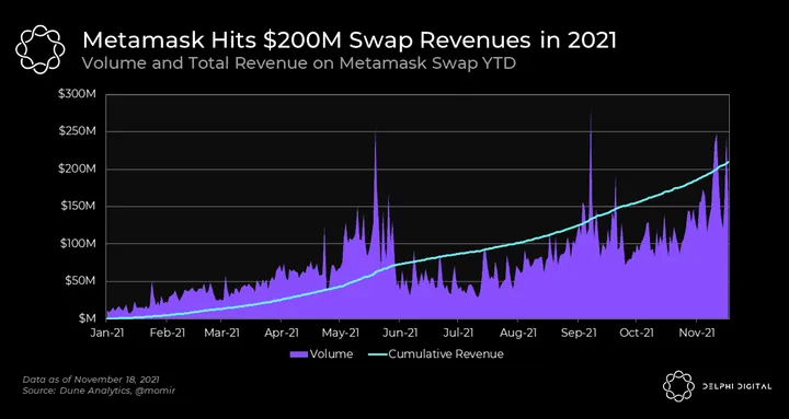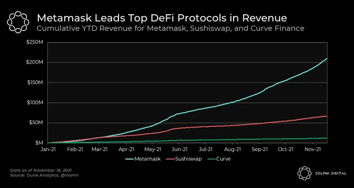 - If you don’t think $200M in revenue over 11 months is a remarkable feat — which you should — compare Metamask’s revenue to that of two of the top DEXes on Ethereum: Sushiswap and Curve. Sushiswap has made just under $70M YTD, while Curve sits around $12M.