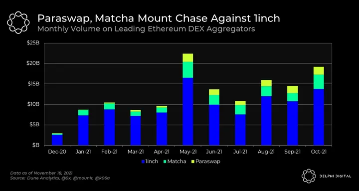 - 1inch is still the leading DEX aggregator by a large margin. However, competitors such as Matcha and Paraswap are starting to eat into its market share.