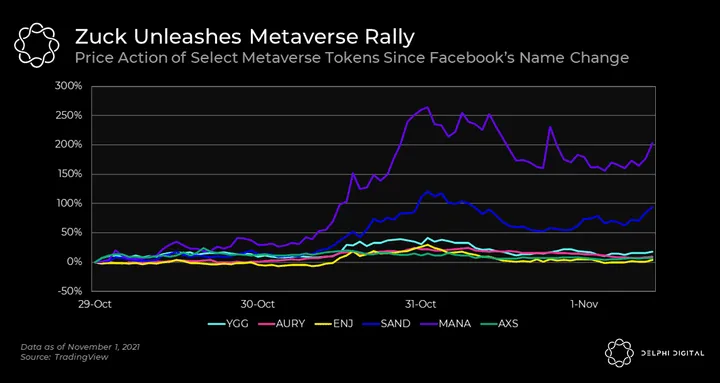 - Metaverse tokens got a boost from Facebook’s announcement that it’s rebranding to “Meta.” MANA, Decentraland’s token, has been one of the biggest beneficiaries, evident in its 200% price surge since the announcement. The Sandbox — a virtual world where players can build, own, and monetize their gaming experiences in the Ethereum blockchain — was the second biggest winner, with its token price more than doubling over the same short time period.