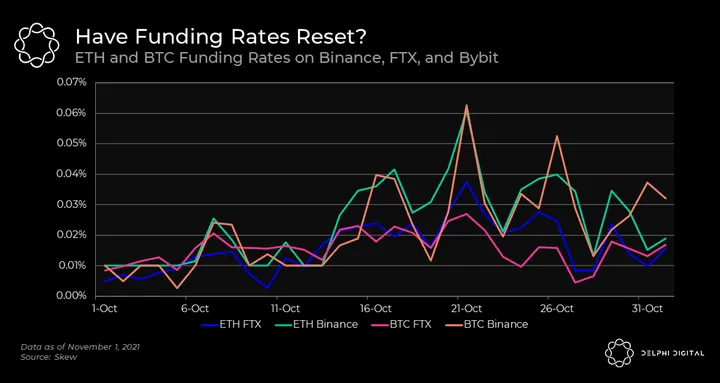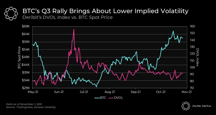 - BTC’s latest rallies in late Q3 and early Q4 have not been met with much action in implied volatility, according to the DVOL index, which measures the approximate implied volatility for a market over the next 30 days. When implied volatility is high, one can say the market is pricing in a lot more price uncertainty, whereas when implied volatility is low, it indicates less uncertainty; implied volatility tends to spike during market sell-offs and trend lower when BTC steadily trends higher.