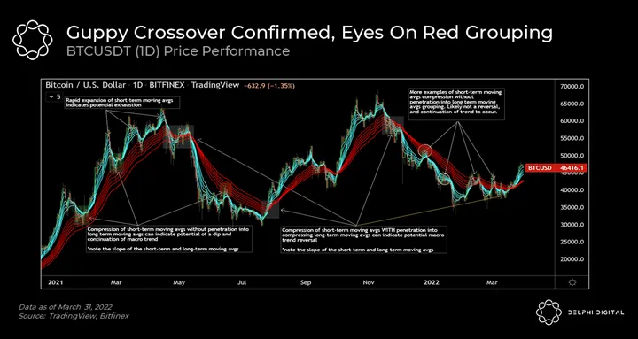 Long-time readers will be familiar with the Guppy Analysis, as it has been one of our favored trend-following tools over the last 2 BTC cycles. In short, using the Guppy Multiple Moving Average has kept participants away from false bottoms while BTC has been in its four month downtrend.