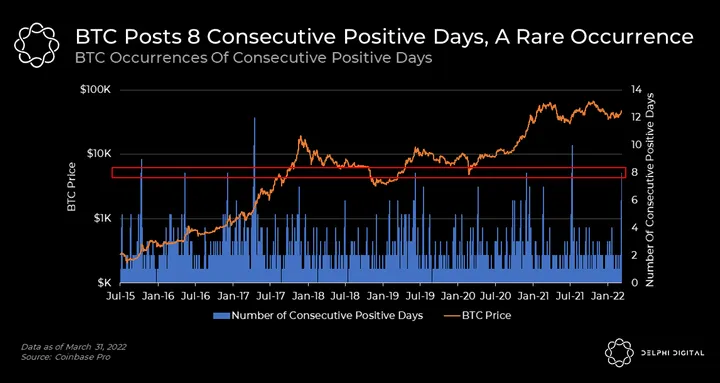 - The last two weeks provided an extremely rare occurrence for bitcoin as it notched 8 consecutive days of positive price gains. Over the last seven years when looking at consecutive positive days for bitcoin returns, this trigger event only happens 1.3% of the time, making this is a very rare event.