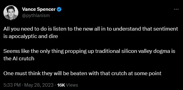 Anyway, the point is, nobody knows what’s gonna happen! The chart is literally ping-ponging up and down. We’re trading off ~vibes~ right now. And unfortunately, in the long-duration corner of the market (tech + crypto), the vibes aren’t great. The most recent All In podcast, E130, offers a case in point.