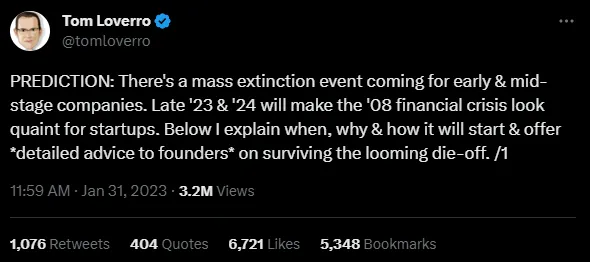 And everything’s been up and to the right so much, it’s been so easy to kind of inflate things, fill up hot air balloons and go up and to the right. And unfortunately, most folks who are working in the investor community that sit on boards weren’t around for the dot com crash the last time this happened. That’s why it’s so challenging right now to figure out a way out. There’s a lot of failure going on in Silicon Valley right now.