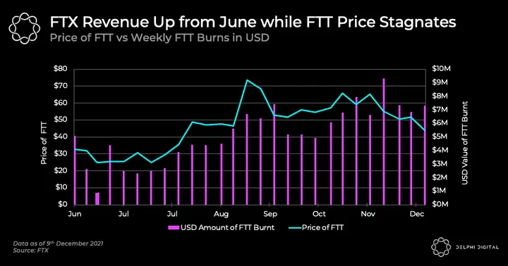 - FTX burns roughly a third of its revenue periodically. The exact breakdown can be found here. Weekly FTT burns, and thus revenue, have steadily increased since Q3 2021 but the price of FTT has failed to keep up with that pace.