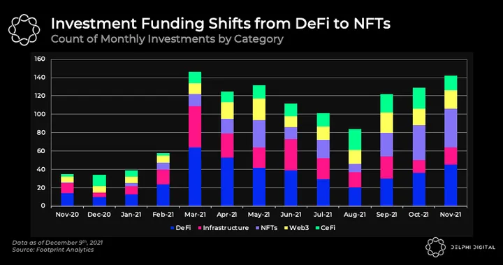 - Over the course of 2021, the makeup of projects getting funding has also transformed. In Q1’21, DeFi was the largest category for investment. More recently, NFT-related projects are the largest slice of deals. (Note: NFTs and Web3 have similar sub-categories like Gaming and Music).