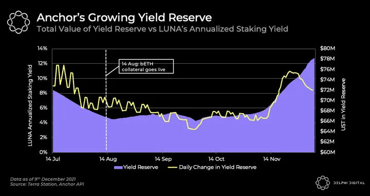 - Since bETH was added as collateral on Terra’s Anchor Protocol, the yield reserve has consistently grown. We previously outlined this phenomenon in a Delphi PRO report.