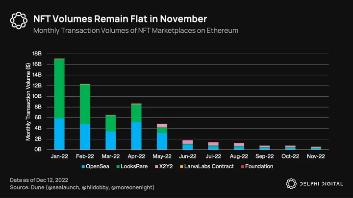 NFT sales volume in most major marketplaces has been flat month-over-month, reaching a new low in November. OpenSea transacted $242.2M in November compared to $295.8M in October, representing an 18% decrease over the previous month. There were notable developments in the broader NFT ecosystem, however: