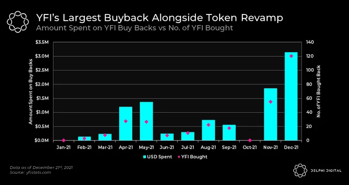 - Yearn Finance has recently started aggressive buybacks, with ~$3.1M or 120.5 YFI being purchased, marking the largest buyback yet.