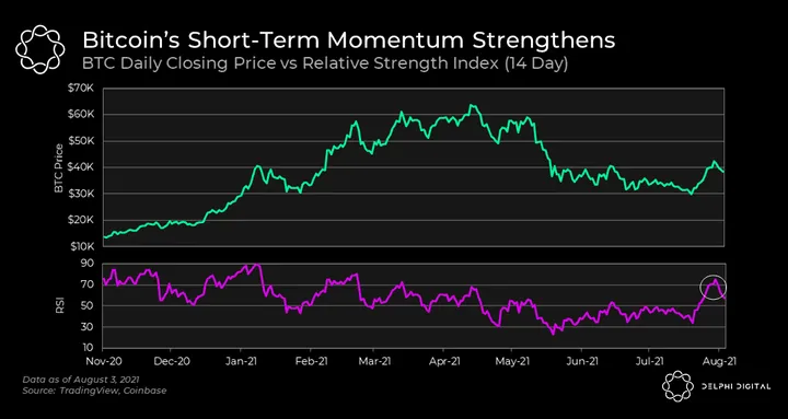 - Momentum indicators support the recent price surge with the 14 Day Relative Strength Index breaking out of a downtrend that kicked off in early Q1. The 14 Day Relative Strength Index—a momentum indicator that looks at the overbought or oversold conditions—broke out of a downtrend that kicked off in early Q1. When bitcoin rallied to $30k up to $40k in late July, the RSI saw a sharp uptick, suggesting BTC moved into overbought territory.