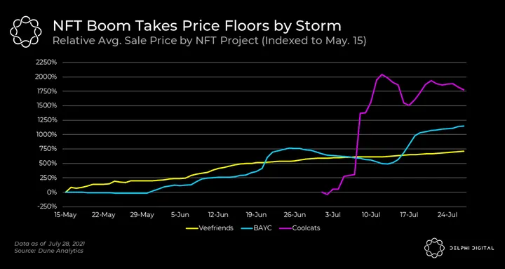 - One example is Gary Vee’s NFT project Veefriends, which has seen notable floor price appreciation of almost 750% since May 15th. Coolcats has also benefited, with floor price up approximately 1750% since its recent launch on July 1st.