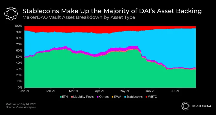 - It’s important to note that even though DAI is still the most widely adopted decentralized stablecoin, the rise in the share of USDC in MakerDAO’s vaults means DAI is not out of regulators’ reach.
