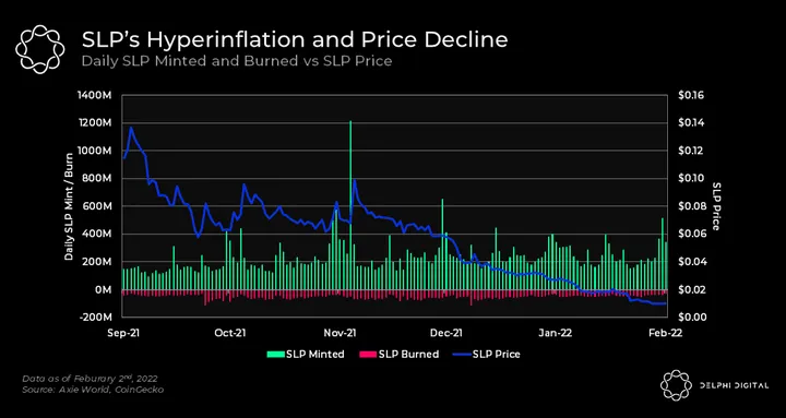 - Axie Infinity has been affected by the hyperinflation of SLP, a result of a high SLP minting rate but a low SLP burning rate. The rapid growth of players from 38k DAUs in April 2021 to the peak of 2.7M DAUS in November 2021 has caused SLP minting to increase massively, as a greater number of players translates to more SLP minting.