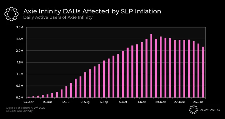 - As previously mentioned, the SLP hyperinflation was mainly due to the explosive growth of Axie Infinity. DAUs grew from 38k in April 21 to 2.7M in November 21.