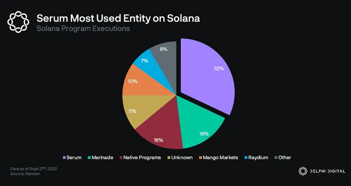 - Serum, an order book application built on top of Solana, is the most used entity that accounts for ~1/3 of Solana program executions. Serum is the “order book layer” on Solana for projects like Mango Markets, Zeta, Atrix, and more to tap into.