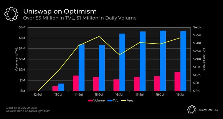 - In just a week, Uniswap V3 on Optimism already commands $5m in TVL and $1m in Daily Volume.