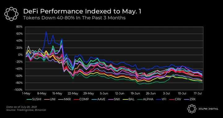 - DeFi tokens lose 40-80% of their value in the past 3 months (indexed from 1st May 2021) – a sign that speculative interest in DeFi as a vertical has waned.