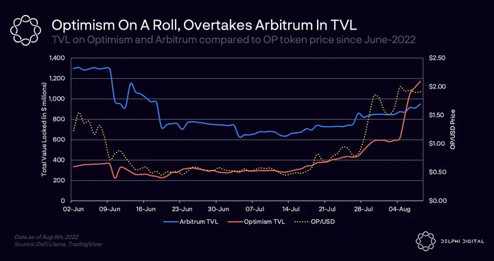 - On August 6, the total value locked (TVL) on Optimism overtook the TVL on Arbitrum for the first time.