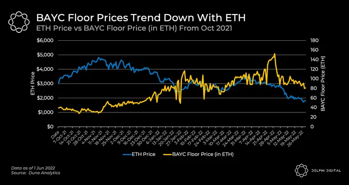 - A narrative that received some traction last year was that ‘blue-chip’ NFTs could be a hedge for ETH prices and that they would hold their value in USD terms. Looking at the data over the past 8 months, it was a reasonable idea between Oct ’21 – Jan ’22. as BAYC floor prices (in ETH) rose even as ETH fell. However, we can see that this is no longer the case, and both BAYC floor prices and ETH prices have been trending in only one direction in May — downwards.