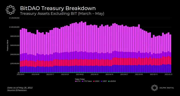 - The key to BitDAO’s success is their large treasury, primarily consisting of ETH. If they lack the funds to invest in new organizations or attract partnerships, BitDAO will fail to create the network’s feedback loop. Luckily for BitDAO, they wield a treasury of more than $1.5 billion in liquid assets accumulated from a series of massive raises. This treasury is still a sizeable $870 million, excluding protocol-owned BIT. The project has a well-diversified treasury of BIT, ETH, FTT, stablecoins (USDT and USDC), and even a small xSUSHI allocation.