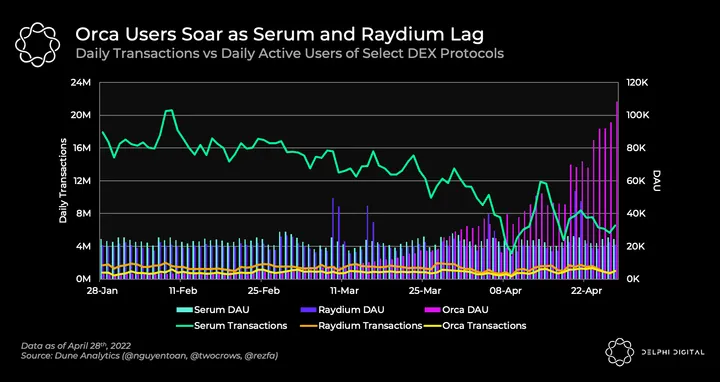 - Orca Daily Active Users (DAU) have seen a rapid climb to 108k, whereas older counterparts Raydium and Serum have stayed around 20k DAUs.