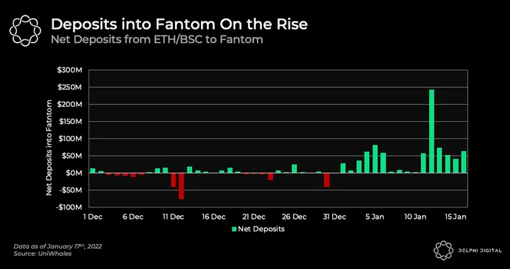 - Bridge data shows that deposits into Fantom have risen significantly since the start of this year. The token prices of various native dApps have risen substantially alongside this, attracting more yield farmers.