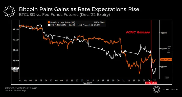 - The FOMC decided to leave rates untouched but signaled for a hike in March’s FOMC. US10Y closed the trading day up 5%, and DXY was up 0.46%. Risk assets like SPX, NDX, and crypto assets wound up pairing back their initial gains as the market digested the Fed’s commentary.