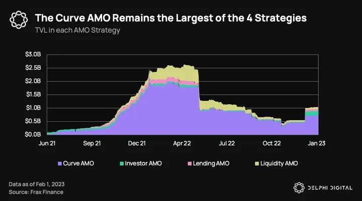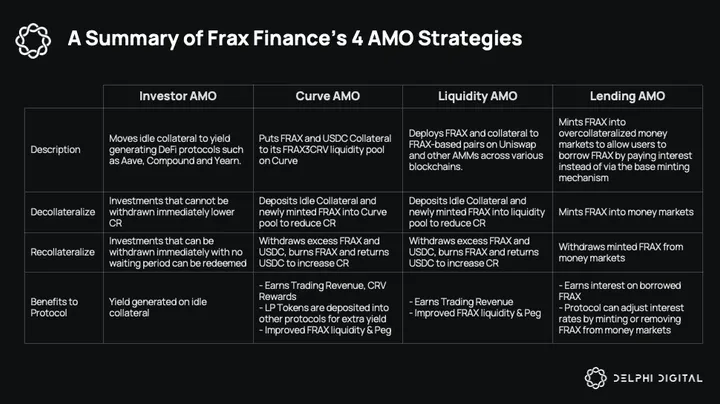 FRAX maintains its stability via “algorithmic market operations controller” (AMOs), which allow the protocol to programmatically regulate the supply and demand of FRAX and its collateral in the market. Frax is running four such AMOs, which we briefly explained in our previous report. A summary of how each strategy works is outlined in the table below:
