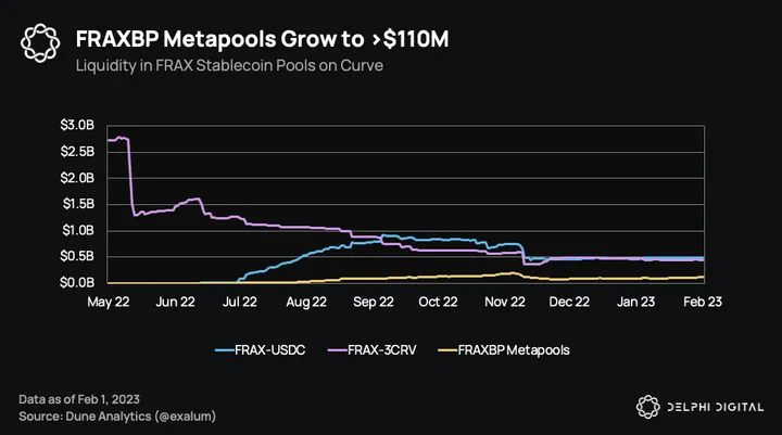 Frax has encouraged the formation of metapools by redirecting token incentives to these newly created Frax pairs. Pairing another stablecoin with FBP in a metapool increases demand for FRAX-USDC. Since the Curve AMO can mint FRAX into the FBP to balance this new demand, it results in Frax earning more fees and rewards from CRV and CVX emissions.