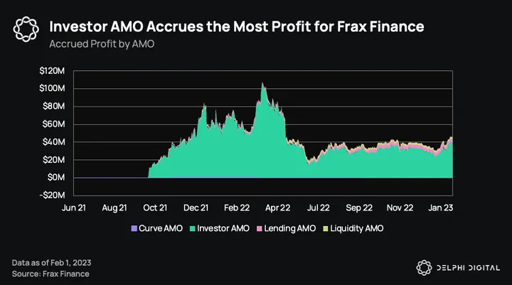 A smaller but synergistic AMO we’d like to touch on is the investor AMO, which has generated over 90% of all accrued profits. The investor AMO holds the protocol’s profits and deploys them to other protocols to generate yield. Some of the AMO revenue is held by the protocol, such as farmed CVX and CRV tokens, which gives Frax influence over governance and token emissions while some of the revenue goes to veFXS holders.