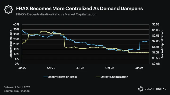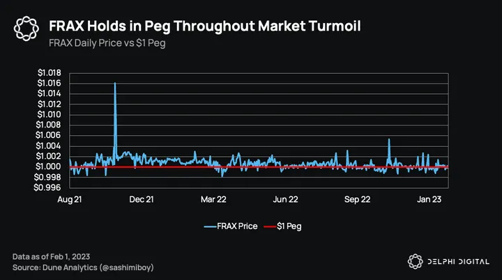 Although FRAX’s decentralization ratio is far from ideal and collateralization has increased from last year, this can be interpreted as a system that works to manage the price stability of FRAX. Over the same period, FRAX has barely deviated from its $1 peg, managing to survive the LUNA/UST fallout and recent market downturn. So while the reliance on centralized assets isn’t great, Frax’s ability to adjust its collateralization and decentralization ratios according to market conditions has proven to be an advantage in keeping FRAX’s price peg — by far the most important thing for a stablecoin.