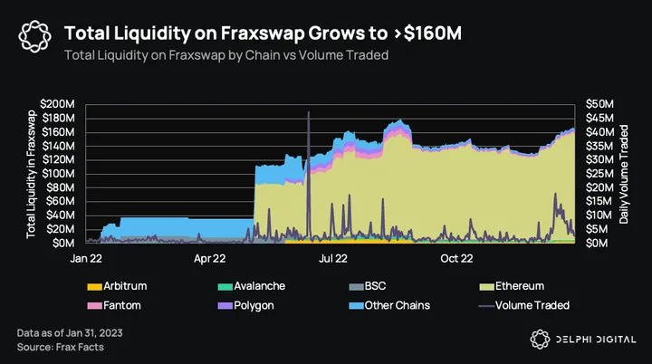 Fraxswap is the first constant-product automated market maker with an embedded time-weighted average market maker (TWAMM) for trustlessly conducting large trades over long periods of time. Since its launch, Fraxswap has been used to increase the stability of Frax’s stablecoins and for minting and burning FRAX. The total liquidity on Fraxswap is around $160M, with average daily volume of $6.3M over the last 30 days.