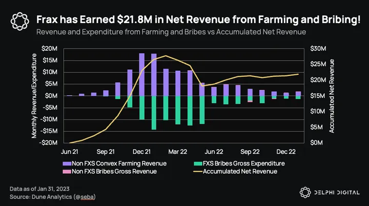 The next largest holding in the investor AMO is locked CVX. With 3.52M CVX, Frax is the largest holder of CVX, which makes up ~6.5% of all locked CVX. Locking CVX allows Frax to earn fees and vote for token emissions to be directed to its stablecoin pools on Curve. Combined with the ability to bribe CVX holders to direct token emissions to their Curve pools and their ownership of said pools, they’ve managed to farm over $21M in token rewards net of bribe expenditures. They’ve done all of this while ensuring deep liquidity for stablecoin pools on Curve.
