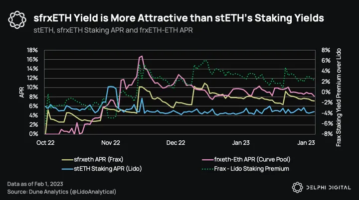 This is likely attributable to its superior staking yields (~7.2%) compared to other liquid staking derivatives like stETH (~4.8%). This yield premium will be sustained as long as the APR on the frxETH-ETH Curve pool exceeds the ETH staking yield.