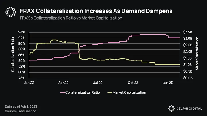FRAX is not truly an algo-stable in the way UST was. It’s partially backed by collateral and the protocol’s native governance token, FXS. Each FRAX token can be minted and redeemed from the protocol for $1 of value. The collateralization ratio indicates the proportion of collateral that backs FRAX. This number sits at 92% currently, up from 82% a year ago. This means that every FRAX minted requires $0.92 of collateral and $0.08 of FXS burnt. A higher collateralization ratio versus a year ago reflects comparatively lower demand for FRAX.