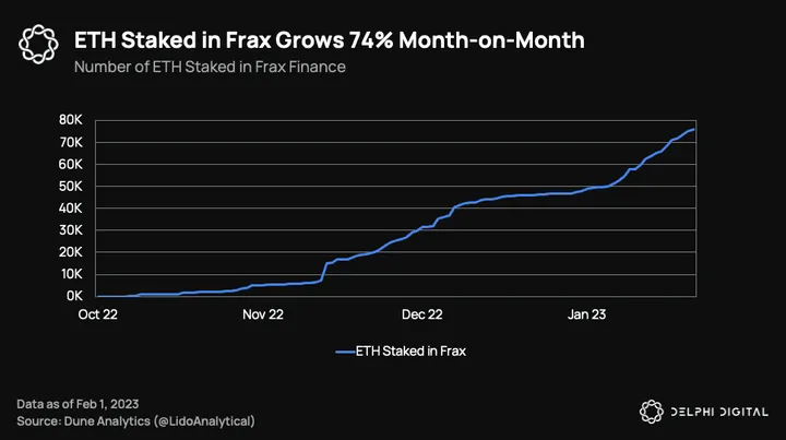 We recently covered Frax’s LSD model in a report titled “The Future of ETH Liquid Staking,” where we detailed how Frax provides enhanced ETH staking yields. Frax Ether is the fastest growing liquid staking service, with over 75k ETH staked — up 74% MoM.