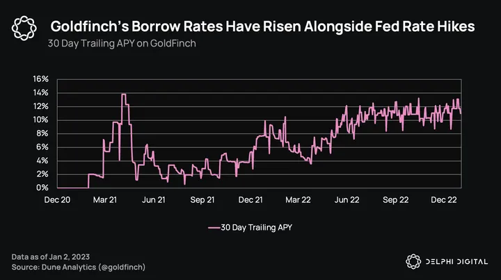 - Goldfinch’s loan rates have risen alongside the fed funds rate, indicating rising borrow costs on the platform. This could be a core contributor to slowing loan growth.